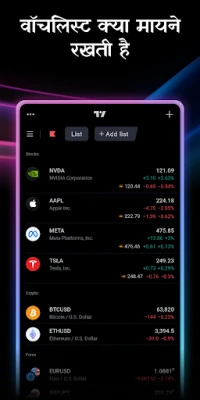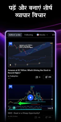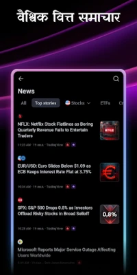निवेशक और ट्रेडर, अब आप वैश्विक वित्तीय बाजारों की नब्ज को अपनी मुट्ठी में रख सकते हैं, कहीं भी, कभी भी। TradingView आपको वास्तविक समय के उद्धरणों और चार्ट तक सीधी पहुँच प्रदान करता है, जो पेशेवर डेटा प्रदाताओं से प्राप्त होते हैं। चाहे आप स्टॉक, वायदा, विदेशी मुद्रा, बिटकॉइन या CFD में रुचि रखते हों, यह प्लेटफॉर्म आपको विश्वसनीय और व्यापक जानकारी से लैस करता है। NASDAQ, S&P 500, डॉव जोन्स जैसे प्रमुख वैश्विक सूचकांकों से लेकर विनिमय दरों और कमोडिटी की कीमतों तक – सब कुछ एक जगह। लाखों सक्रिय ट्रेडरों और निवेशकों के सबसे बड़े सामाजिक नेटवर्क से जुड़कर अपनी अंतर्दृष्टि साझा करें और दूसरों के अनुभवों से सीखें।
