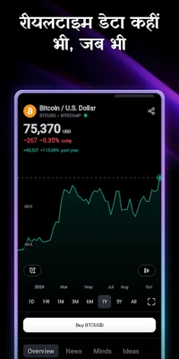 अपनी व्यक्तिगत वॉचलिस्ट बनाएं और वास्तविक समय में प्रमुख वैश्विक सूचकांकों, शेयरों, मुद्रा जोड़ों, बॉन्ड, वायदा, म्यूचुअल फंड, कमोडिटीज और क्रिप्टोकरेंसी को ट्रैक करें। अनुकूलन योग्य अलर्ट आपको बाजार में छोटे से छोटे बदलावों से अवगत कराते हैं, जिससे आप निवेश करने या बेचने के लिए सही समय पर प्रतिक्रिया दे पाते हैं और अपने संभावित लाभ को अधिकतम कर सकते हैं। आपके सभी सहेजे गए विश्लेषण, चार्ट और सेटिंग्स स्वचालित रूप से TradingView प्लेटफॉर्म से आपके मोबाइल डिवाइस पर सिंक हो जाते हैं, जिससे कहीं भी निर्बाध पहुंच मिलती है। न्यूयॉर्क, लंदन से लेकर टोक्यो और मुंबई तक, 50 से अधिक वैश्विक एक्सचेंजों से 100,000 से अधिक उपकरणों पर वास्तविक समय डेटा का अनुभव करें, जिसमें सोना, तेल और सभी प्रमुख क्रिप्टोकरेंसी शामिल हैं।
